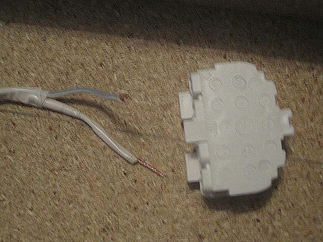 Cada uno de estos portalámparas tiene cuatro orificios dobles en la parte inferior, cada orificio corresponde con la entrada de un hilo, ojo, en nuestro caso el cable, lo hemos comprado de doble hilo por lo cual habrá que separarlo, lo cual se puede hacer fácilmente de manera manual, si el cable se resiste separarlo con una navaja